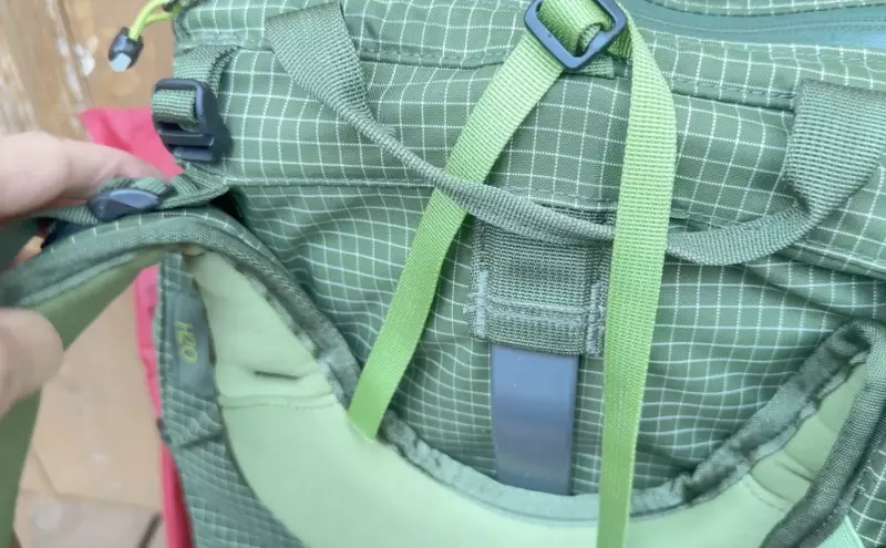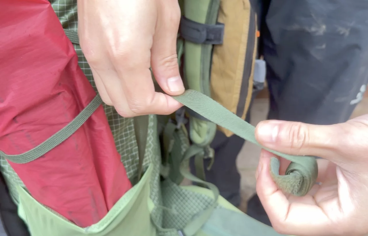 最上部のストラップを引っ張るとザックの上半分がコンプレッションされ、最下部のストラップを引っ張るとザックの下半分がコンプレッションされます。このコンプレッション方法に慣れるまで少し時間がかかりました。ストラップは軽量化のため細いので「使いづらい」と取るのか「軽量化」と取るのかと人それぞれの判断があると思います。