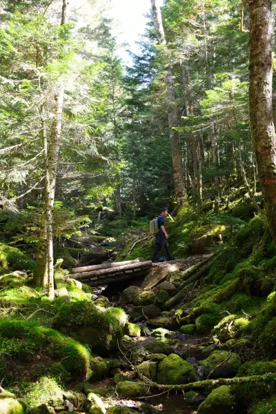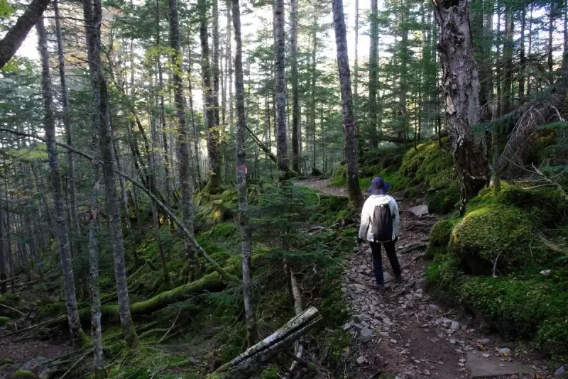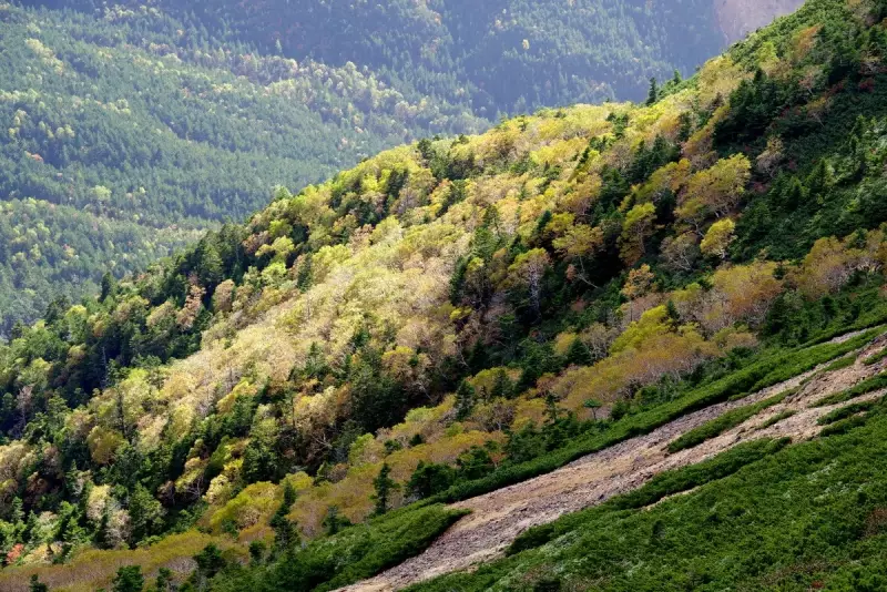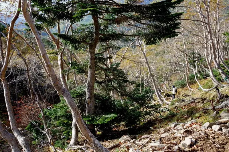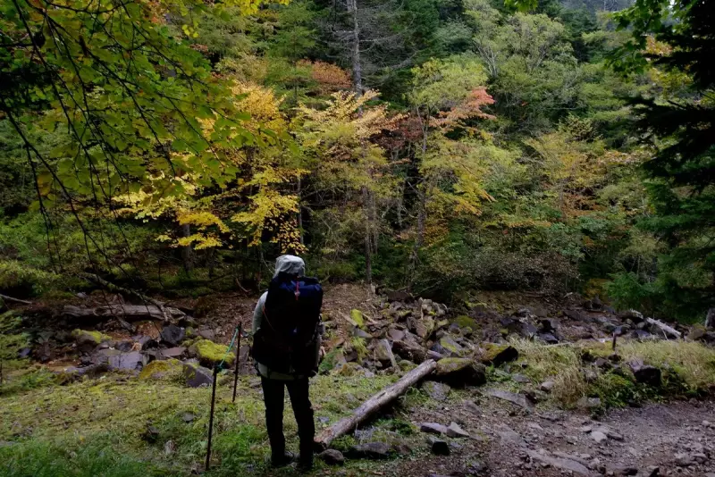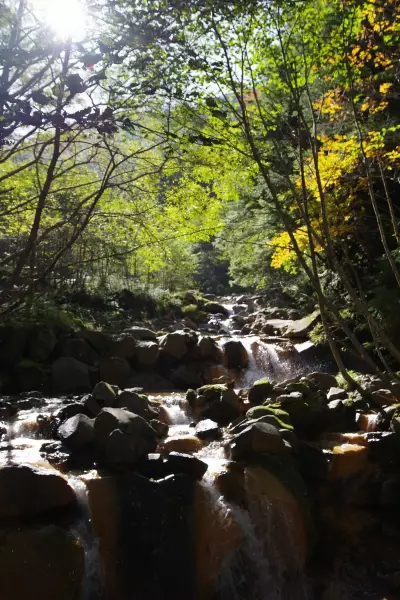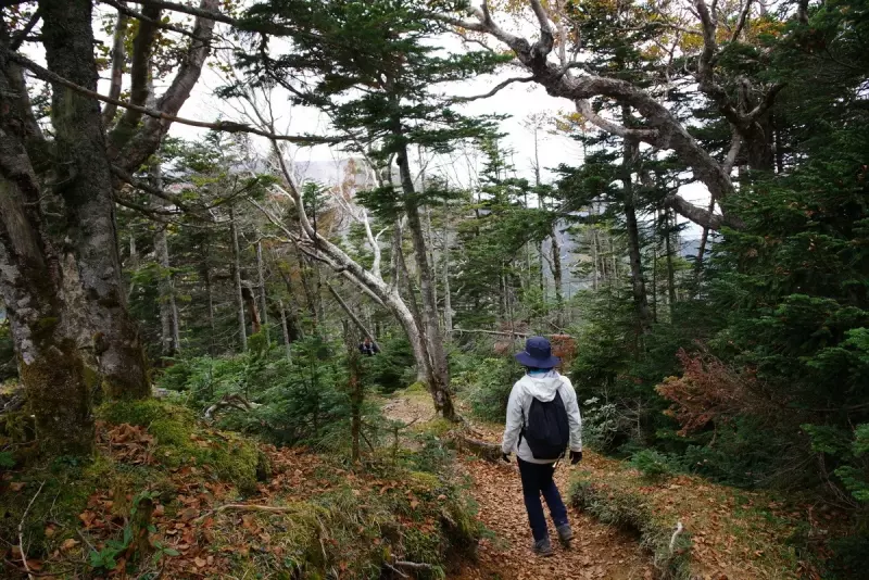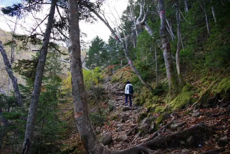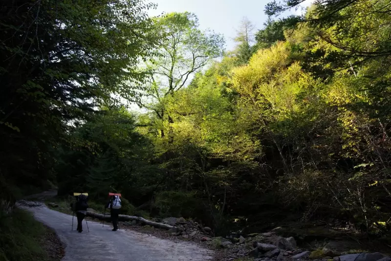 9時に出発、オーレン小屋までの道中、美しい森林が広がり、渓流のせせらぎが心地よく、苔むした岩や木々が幻想的な雰囲気を。ただ、この時期はまだ黄葉には早く、この辺りの紅葉のピークはもう少し先です。