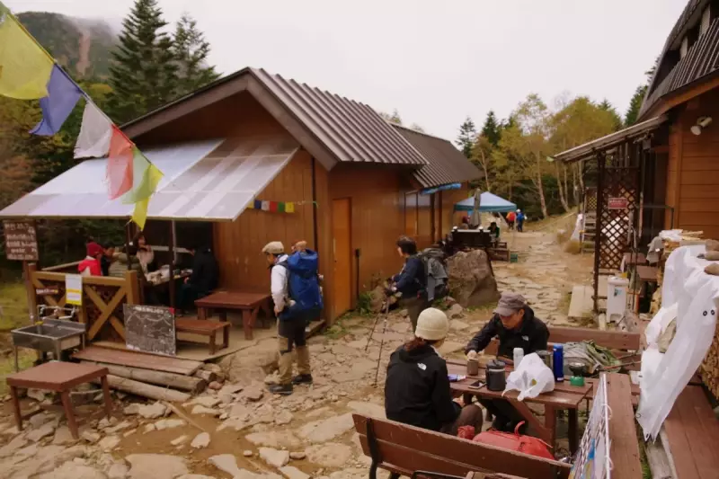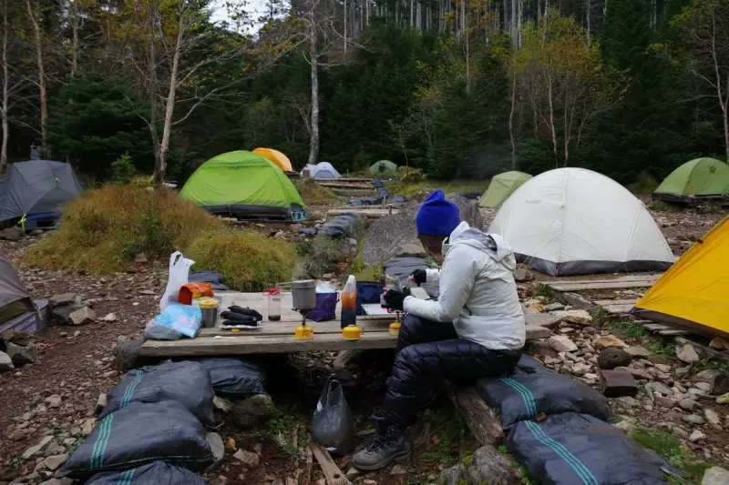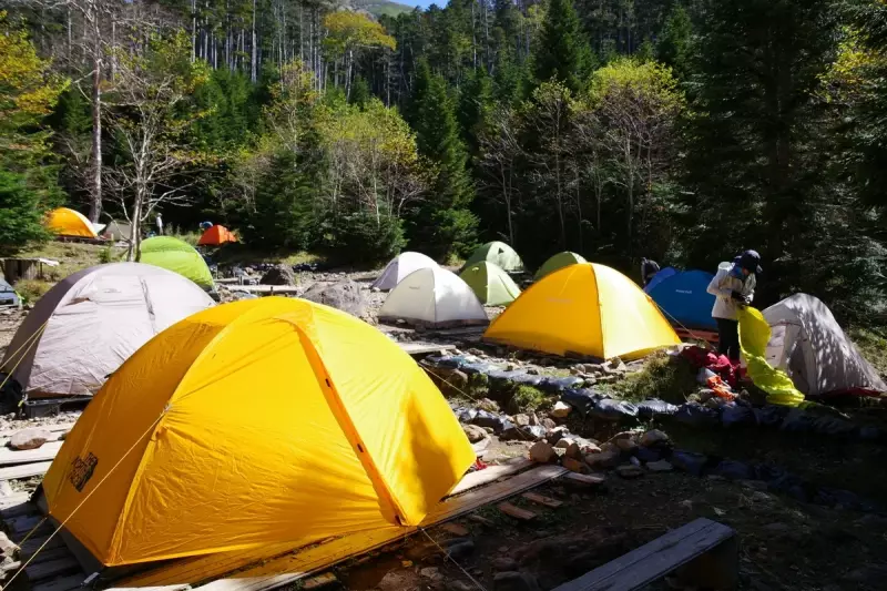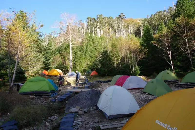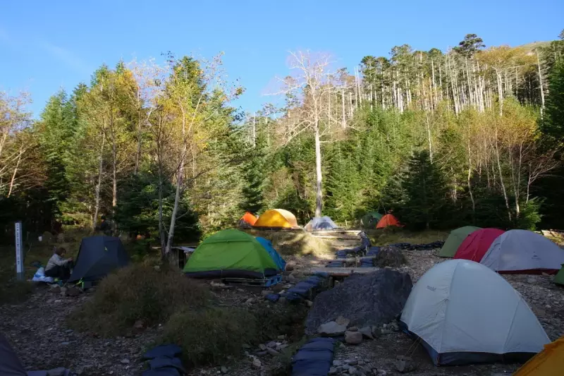 テント場もオーレン小屋の魅力の一つ。広々としたテント場は、周囲の自然に溶け込むように設計されており、秋の夜には澄んだ空気の中で星空を眺めながら過ごすことができます。早めに到着して良い場所を確保することをお勧めします。