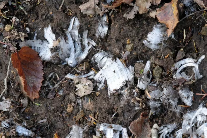標高2500mを超える登山道の傍らは霜柱、10月ともなれは夜間は氷点下で、日陰は日中も解けずに残ります。