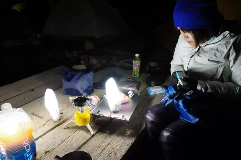撮影が終わると次は山飯の準備。なにしろメーカー関係者の人なのでランタンには困らない、軽量な明かりはいくつでも持ってこれます、私たちのサイトはまるでイカ釣り漁船の様相。それがULか?って言う突っ込みは無しで。