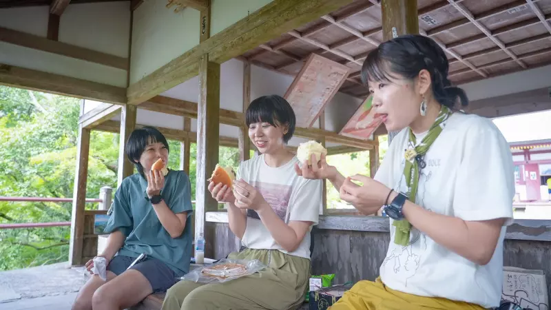 周回コースから下山して、みんなでおやつを食べた。私は前日に大阪から戻って来たところだったので「りくろーおじさんのチーズケーキ」を丸々一個山に持ってくるというあたおか行動食を準備してきていた!