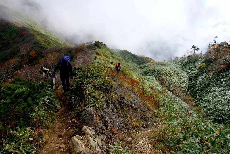 登ること2時間半、変化の無い景色に飽きてきた頃、堂岩山山頂に到着ですが視界は無く、パートナーと「ここはツマラナイ山だねー」などと会話しますがそこからチョット先が凄かった!