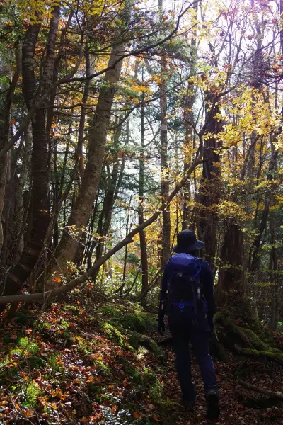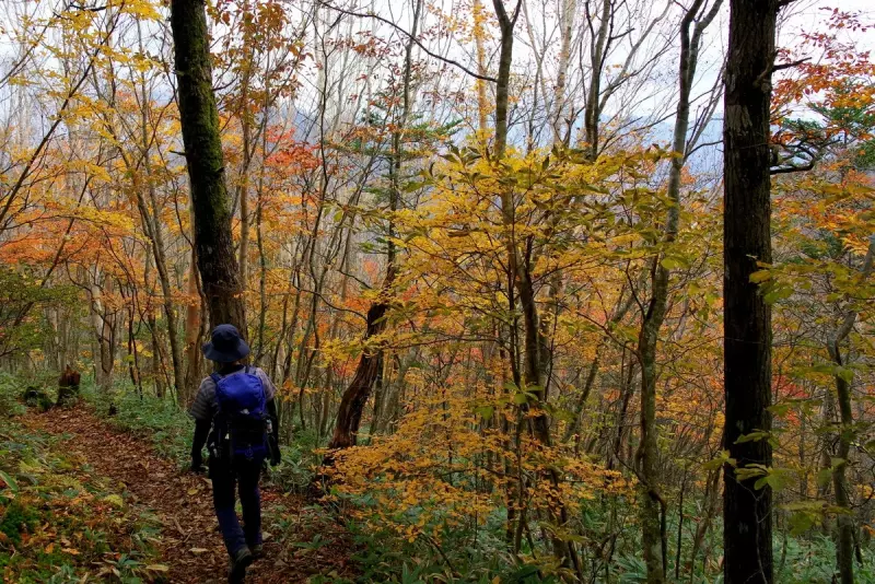 10月16日、湖畔の白樺は落葉し、紅葉への期待値は低かったのですが、登山道入り口から程なくして見事な紅葉の中に身を置くこととなります。