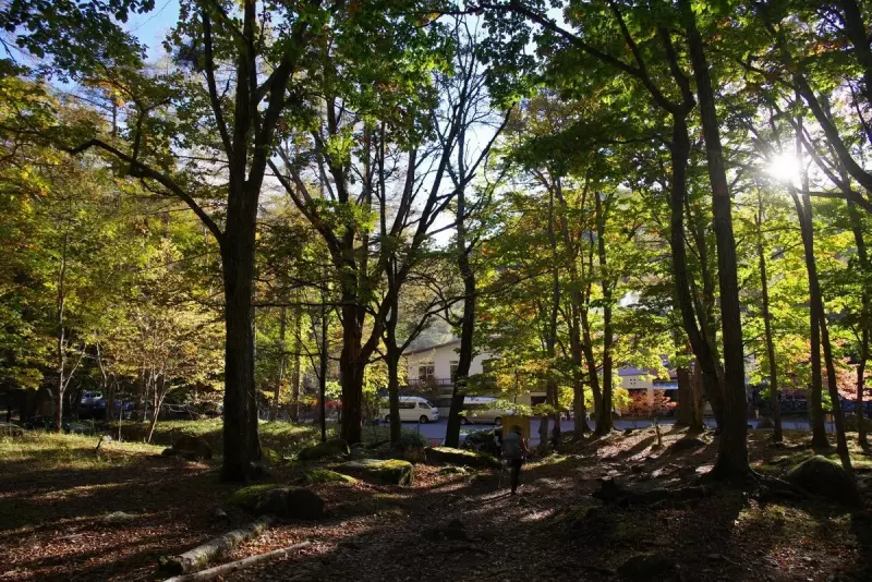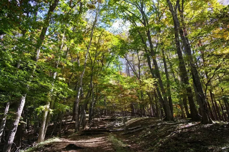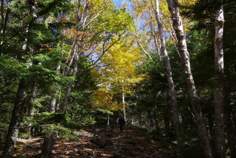 登山道を進むと、そこは秋の絵画の世界。山麓はカラマツだけではなくブナやカエデの秋色が目に。そんな彩が陽光を浴びて輝く樹林帯の中を行きます。