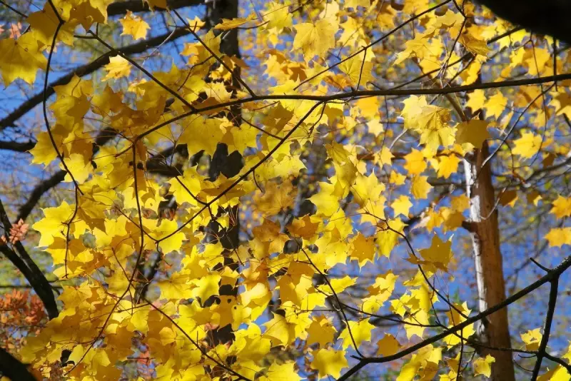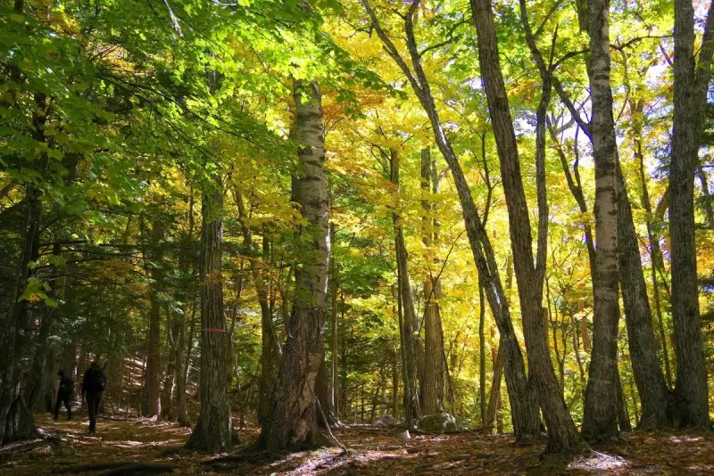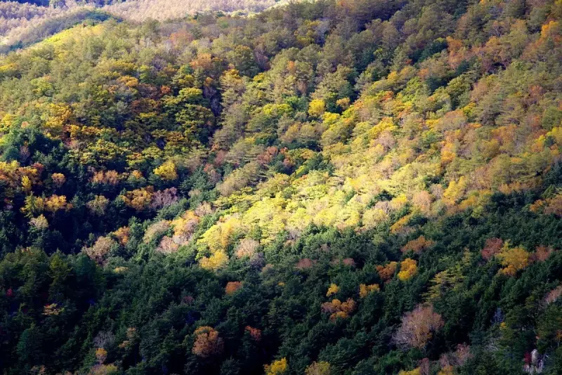 途中、瑞垣山を一望できるポイントでは、黄色く染まった山肌が黄金色の絨毯を敷き詰めたような輝きを放ちます。