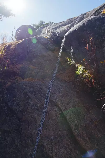 分岐から先、鷹見岩への登山道は存在を疑うほど狭く、そして荒れてます。直下の鎖場は少し緊張。