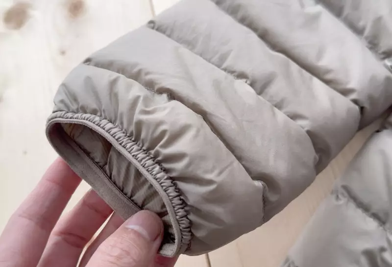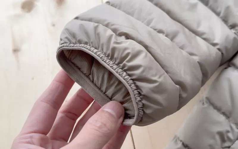 手首はシンプルなゴムバンドで優しく手首にフィットする作りです。登山での使用で寒いと感じることは少なく、軽量なダウンジャケットならではの作りと理解することができるデザインです。