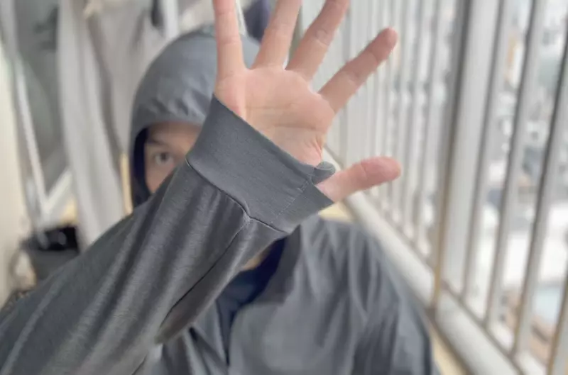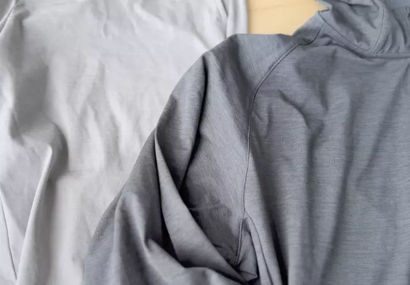 袖口はストレッチバンドなど一切ないシンプルな作りで、腕をまくり上げても落ちづらく、またサムホールがついているので、袖口からの風の侵入を防ぎ手首を温めることも可能です。だから速乾性と通気性に優れたフーディなのですが、シーンによってオールシーズン使えるアイテムです。