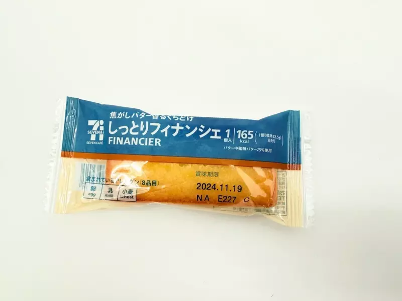 ブルボンがセブンイレブンオリジナル製品として開発した本格的な味わいのフィナンシェです。日本、ドイツ、ニュージーランド製造のバターを使っていて、生地中には黒い粒があるのですが、これがアーモンドの皮で香りもいいし味もいいし価格も安いし、行動食として1つあると元気が出ます。