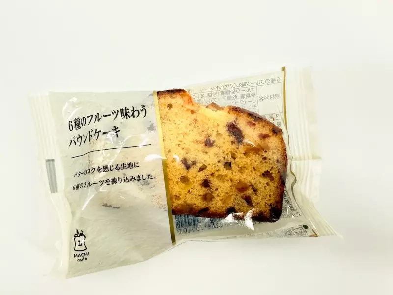ローソンのマチカフェシリーズは、無印良品のような可愛らしいパッケージデザインで本格的なお菓子が販売されているので気に入ってチェックしています。パウンドケーキはオレンジピールやレーズン、チェリーなどが入っていて洋酒仕込みなので大人っぽい味わいです。