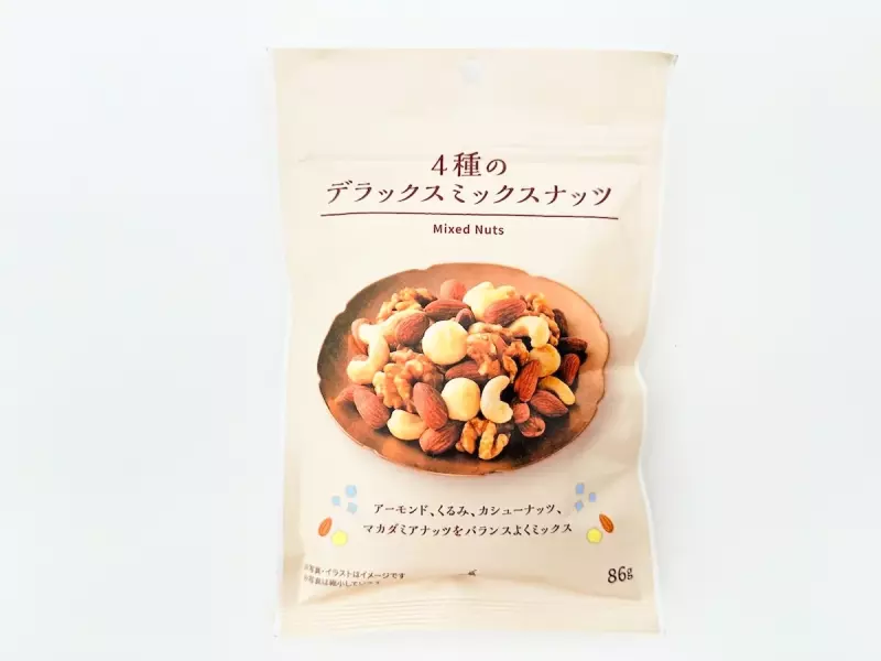 アーモンド、くるみ、カシューナッツ、マカデミアナッツの4種類をバランスよくミックスしています。色々なミックスナッツを食べてきた中でも本格的な味わいで気に入って食べています。無塩の素焼きナッツも好きなのですが、山では食塩配合のミックスナッツを選ぶことが多いです。