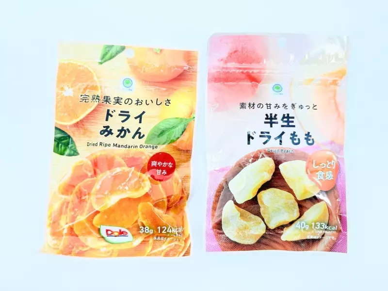 ファミリーマートで購入する行動食はドライフルーツが多いです。ドライみかんはファミリーマートと株式会社ドールが共同開発した商品で、爽やかな甘みでドライフルーツの中でもとても美味しくおすすめです。このドライフルーツも山歩きJPの女性2人に教えてもらったもので、気に入って食べています。
