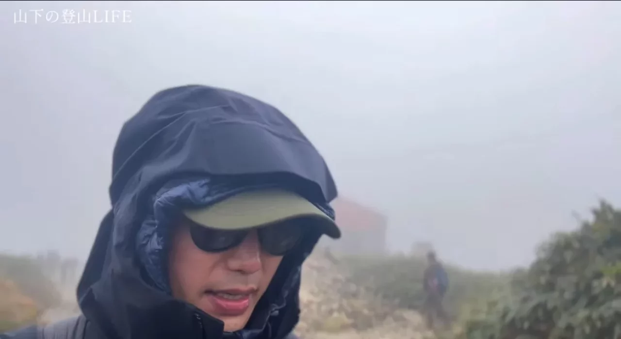 肩の小屋付近で辺り一面のガス&強風