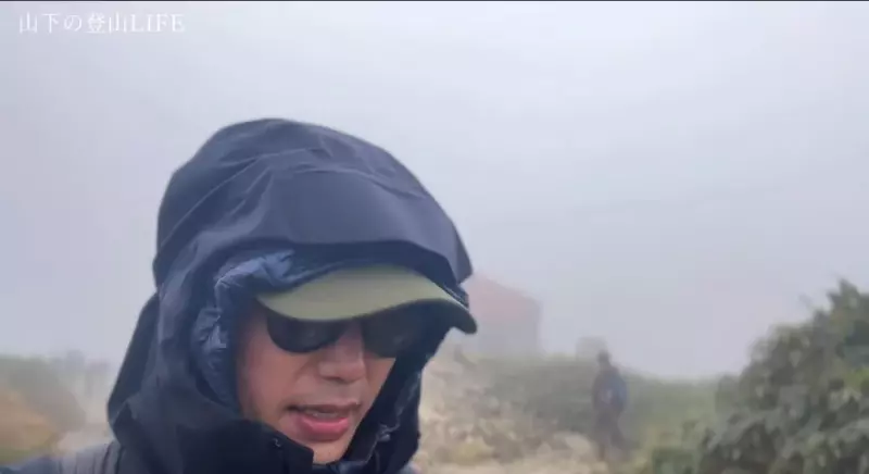 肩の小屋に到着する事には辺り一面ガスに包まれかなり強い風が吹いていました。