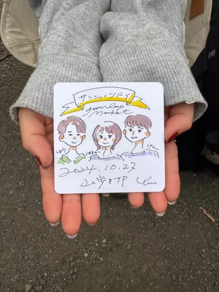 似顔絵を始めたところで、ぼーっとお客さんを眺めながら、ジュンに「あの方、前髪が短くて可愛い、似顔絵描かせてくれないかな」とコソコソ言っていたらどんどんJPのブースに近づいてきて、「いつも見てます」と言ってくれた。なんと視聴者さんで、似顔絵も描いてほしいと言ってくれたので、言ってたことが本当に叶って記念すべき似顔絵第一号のお客様になった。手が震えて上手く描けなかったのは、アルコールのせいにしたけど、その次に描いた時には震えてなかったから、やっぱものすごく緊張していたのだと思う。線が揺れちゃったけど、それも私の初めてが故だから思い出として持って帰ってくれたら嬉しいな。