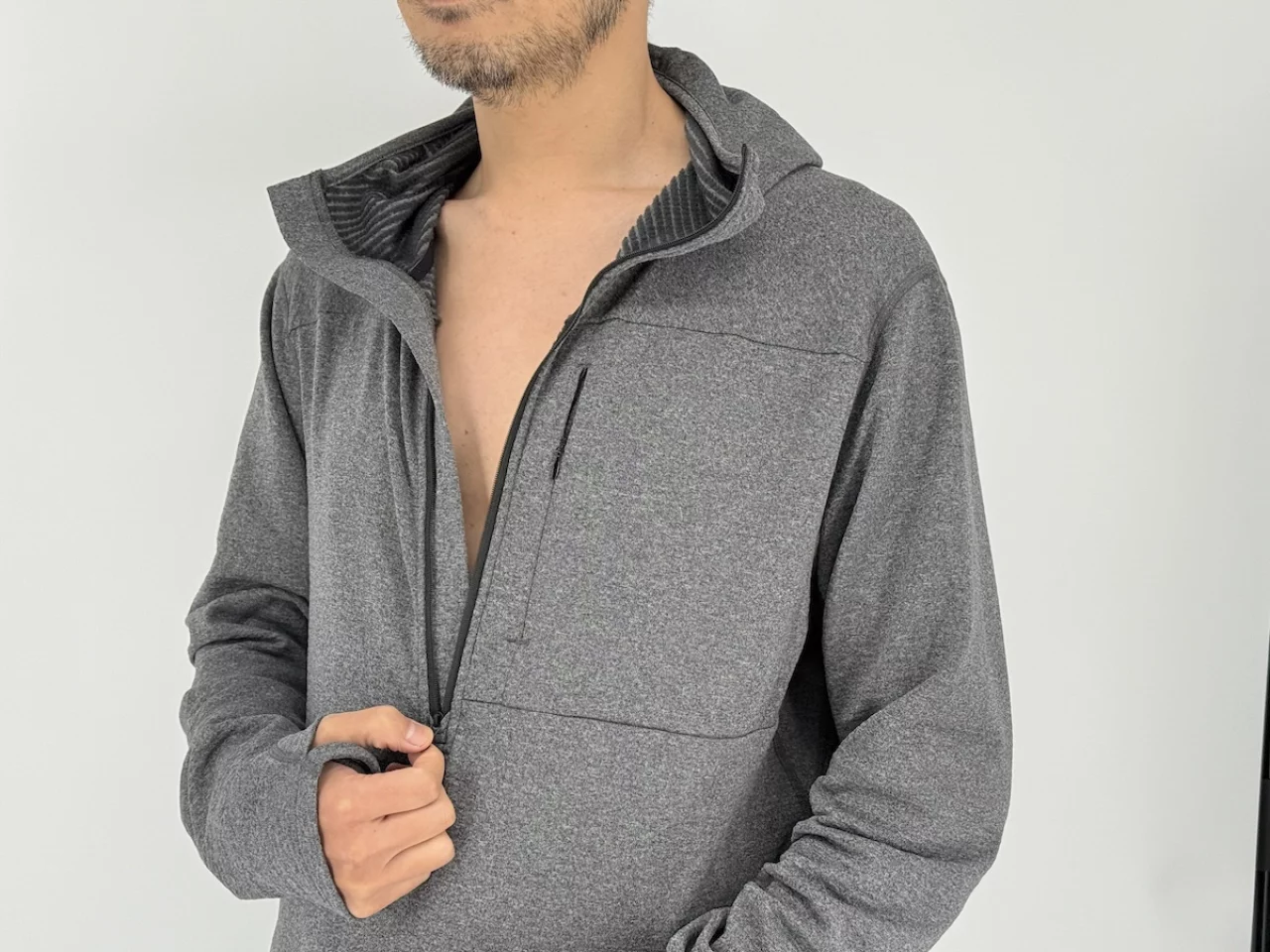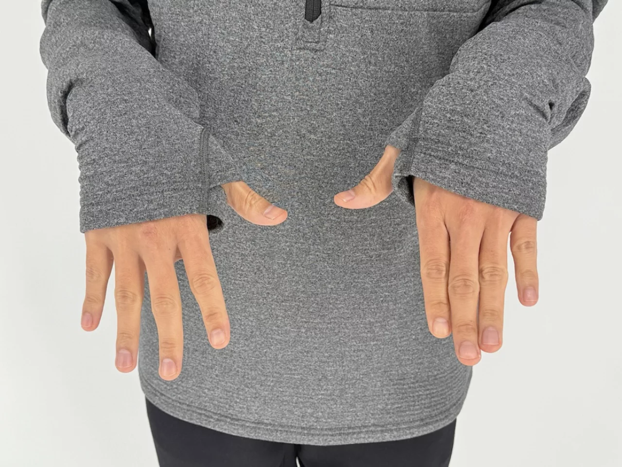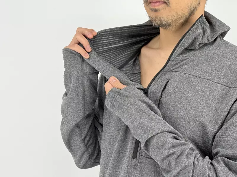 袖口はサムホール付きで手の甲を温め、冷たい風が手首から侵入されづらいように作られています。着用し続けても素材が伸びづらいので、暑くなれば腕まくりをして行動することができるし、ジップアップなので胸元までジップを開いて冷たい風を直接体の中に取り込むことができます。