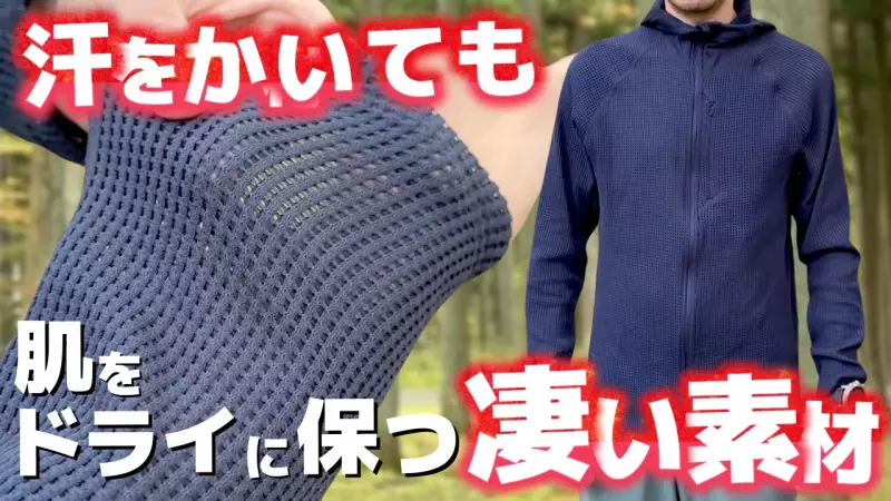 二重ニット構造の内側は汗を素早く吸い上げる力があり、表側は吸い上げた汗を拡散して素早く乾く構造で、ポリエステル素材ながらも気化熱によって肌が冷たくなりづらい特徴があります。さらに通気性に優れているため熱がこもりにくく、ほどよく暖かく、程よく涼しい状態を保つように作られています。