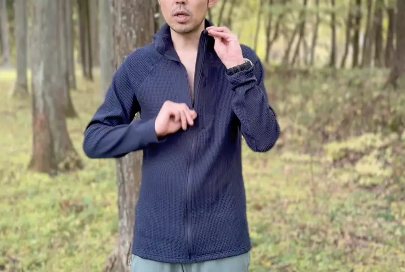 ベースレイヤーとして着用する時にフロントジッパーが直接肌に触れないようにフラップがついています。そしてフルジップのベースレイヤーなので通気調整が非常に容易に行えます。
