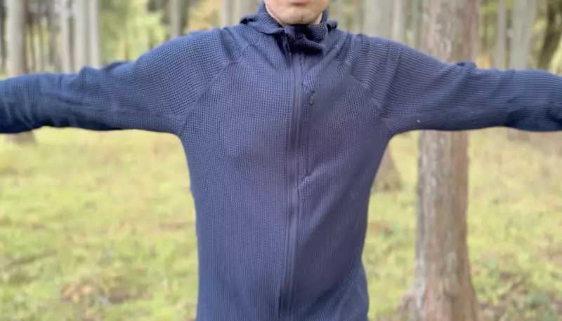 今回このパワードライネットメッシュの特徴を確認するためにフーディニの「ペースフローフーディ」を着用しました。フルジップタイプで、フードが付いており、見た目的にはミドルレイヤー向きのフーディですが、そのような使い方もできるし、最も特徴を体感するのには、ベースレイヤーとして着用するのが良いでしょう。