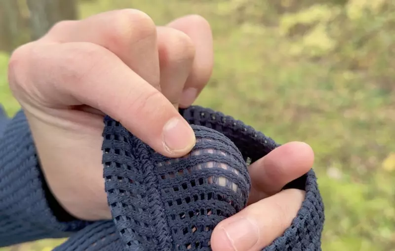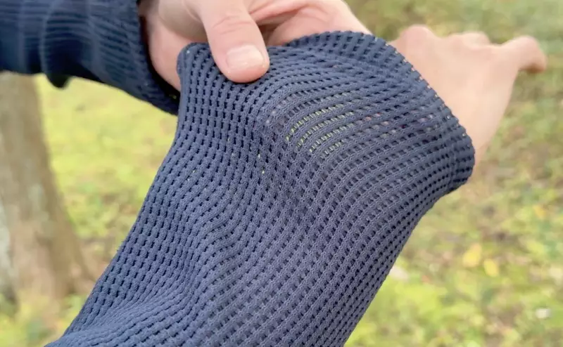 今回紹介するポーラテックの新機能素材「パワードライネットメッシュ」は名前からもわかるように肌をドライに保つことに特化したオープンメッシュ状の素材です。僕が知っている素材の中では最も穴が開いていることがわかるもので、通気性が高いことは着用しなくても解るような、そんな素材です。