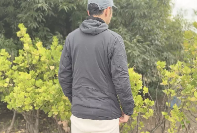 後ろ中心丈が74cmで、僕が愛用しているアークテリクスのカイヤナイトジャケットがMサイズで65cmなので、少し長めです。これは腰やお腹を冷やしづらく保温を目的としたミドルレイヤーと考えると理にかなったシルエットだと思います。