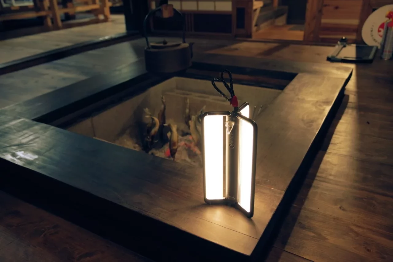星尾温泉の囲炉裏端にHEXAR CL6 、キャンプ用として開発したプロダクト。大光量でもい優しい光、折りたたんでスマートに収納できることを特徴とします。そのモダンなフォルムは和の空間にも違和感なく溶け込みます。