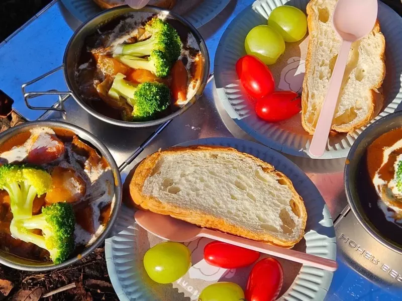 山で煮込んでくれたビーフシチュー、めちゃくちゃ美味しかったぞ!私に味見役をさせてくれて先に一口飲んだけど、ルーが濃すぎなくてすごくちょうどよかった。マッシュルームとかブロッコリーとか、ちょっと高級な具材が入っているのも、細かいところにおもてなしを感じて嬉しいね。お鍋まるまるいっぱいに作ったビーフシチューを5人で分けて、私とジュンにはおかわりまでさせてくれて、鍋が空になった。私たちばっか食べすぎていいのかな?と思っていたら「あー全部なくなってよかった」と言っていたので、どうやら残すよりよっぽどよかったらしいということを知った。