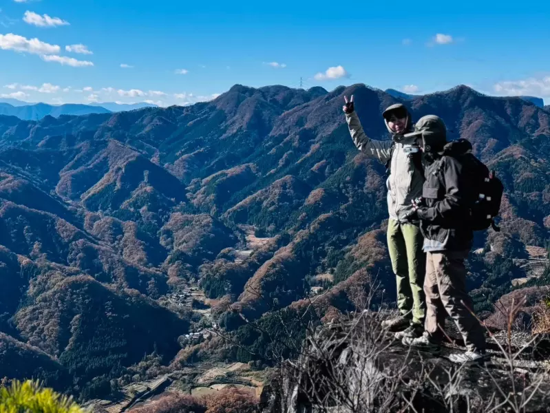 鹿岳はとても素晴らしい山で、朝日が当たるところだけ黄色く発光している紅葉と、だんだん近づいていく妙義山、大きな岩が二つ聳える景色、そして奥の市街地で視界いっぱいで展望を楽しむことができた。