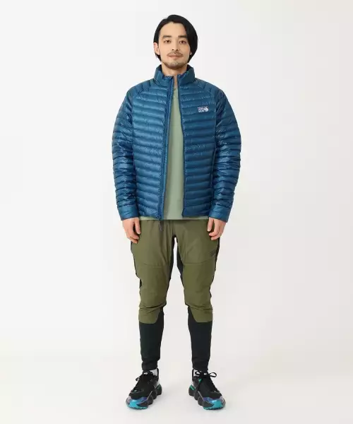 ダウンと化繊を封入したハイブリッドな軽量ダウンジャケットで濡れても温かさを保ち、行動着としても積極的に活用できる、登山者に人気の高いモデルです。表生地はソフトな肌触りで強度があり、撥水加工を施しているため、急な天候変化にも対応します。