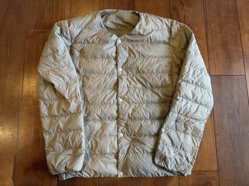 襟はなくノーカラータイプのダウンジャケットなのでレイヤリングしやすい一方で、首を温めることに劣るので防寒着として使用するのには課題感があります。