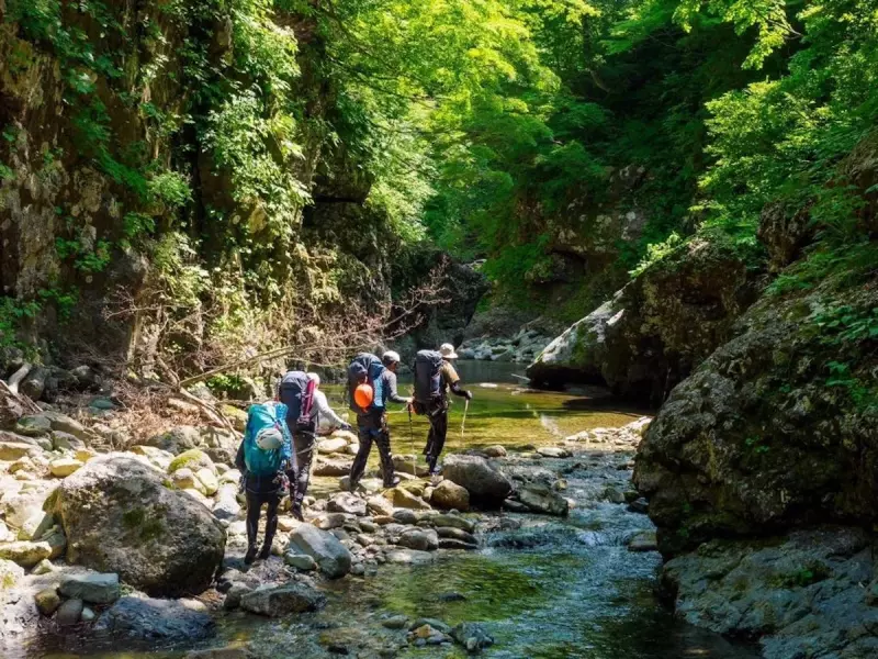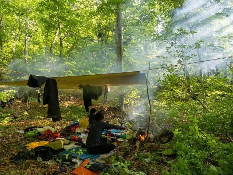 米がどうやら炊けたような僅かに焦げた匂いがする。ようやく私は覚悟を決めて起き上がり、シュラフのまま体育座りになって起きたばかりの若い炎を見つめる。若い仲間が米の炊け具合をうかがっている。ブナの森から漏れた真っ直ぐな光がタープの床の隅に差しはじめた。その低く美しい光の軌道が、流れの上の朝靄を貫いているのがよく見える。その朝靄に焚き火の煙が混ざって絵の具のように溶ける。