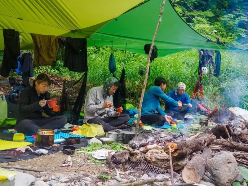 米を研ぐ音、乾いた小枝を拾う音。寝てるものを起こすまいと、音を立てぬよう鍋を火にかけているのがわかる。谷底の朝は遅い、まだ私は起きない。目を開けずに、枕元の夜露の濡れ具合、鳥達の囀りの様子で今朝の天気を感じてみる。