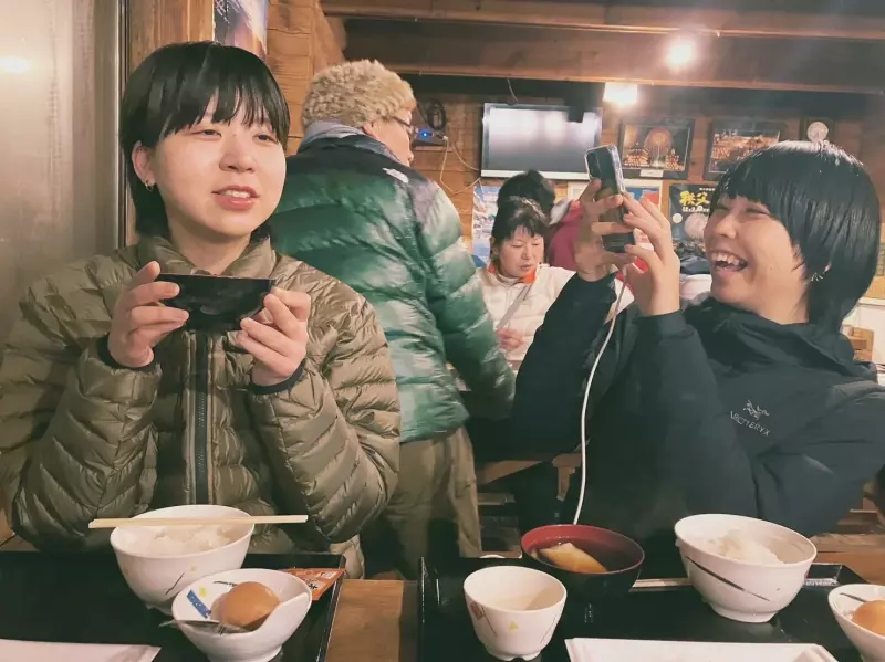 山小屋のご飯、ハンバーグだった。年越しそばが味噌汁のポジションでくっついていて、年越し仕様になっていた。今日泊まる人全員がひしめき合ってご飯食べてるの、なんか合宿みたいで面白かった。直人くんはご飯をおかわりしていた。
