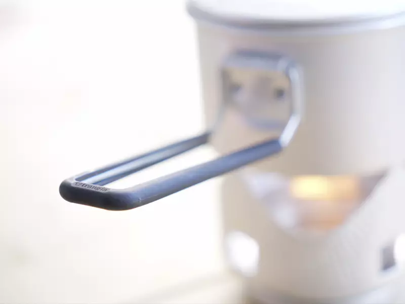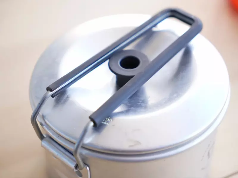 ハンドルは曲げた時の硬さがほどよく、蓋をして固定した状態で動きません。またクッカーに対して真横にハンドルを備えることもできますし、約30度ぐらいの角度でハンドルを固定させることもできます。これによって足元に火があるときにクッカーを置く・取るが便利です。