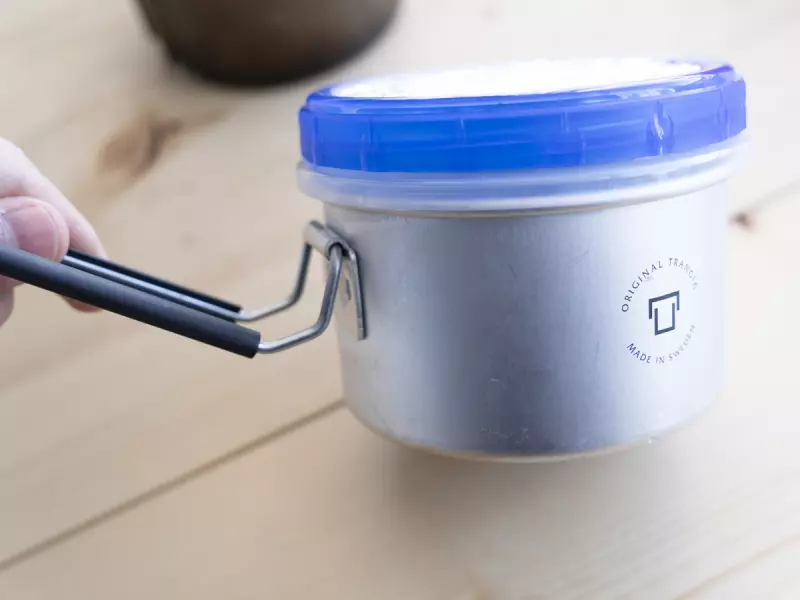 ジェルや固形燃料用のバーナーと風防一体型のゴトクは500mlの蓋付きクッカーに収納することができ、ハンドルを180度回転させて蓋を固定することができるデザインです。