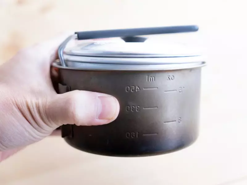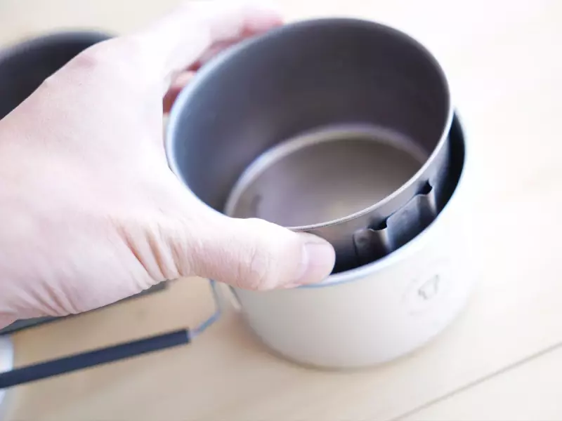 トランギアの「マイクロライト」は実容量が400mlですが、ボコボコと沸騰させなければ500mlお湯を沸かすことができます。内側には100mlずつのメモリがついており、500mlの目盛りはクッカーの口から約0.5cm下に位置しています。