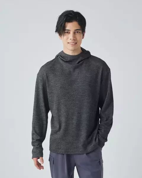 袖の内側にはフィンガーループがあり手首を冷やさないように行動することができたり、フィット感に優れたフードは耳や頭を覆い隠すため風が強い場所で活用することができます。またメリノウールは紫外線対策にも優れた素材なので雪山、日差しが強い稜線上を歩く時にも便利です。夏は1枚で、冬はレイヤリングをして、というように汎用性にも優れています。