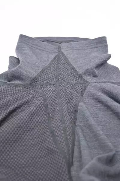 メリノウール53%、ポリエステル47%の混紡繊維を使用した、フワッとした着心地のベースレイヤーです。混紡されているポリエステルはクールマックスと呼ばれる機能素材で、糸の断面に溝があり、これによって汗を素早く吸い取り拡散する毛細管現象を生み出し肌をドライに保ちます。