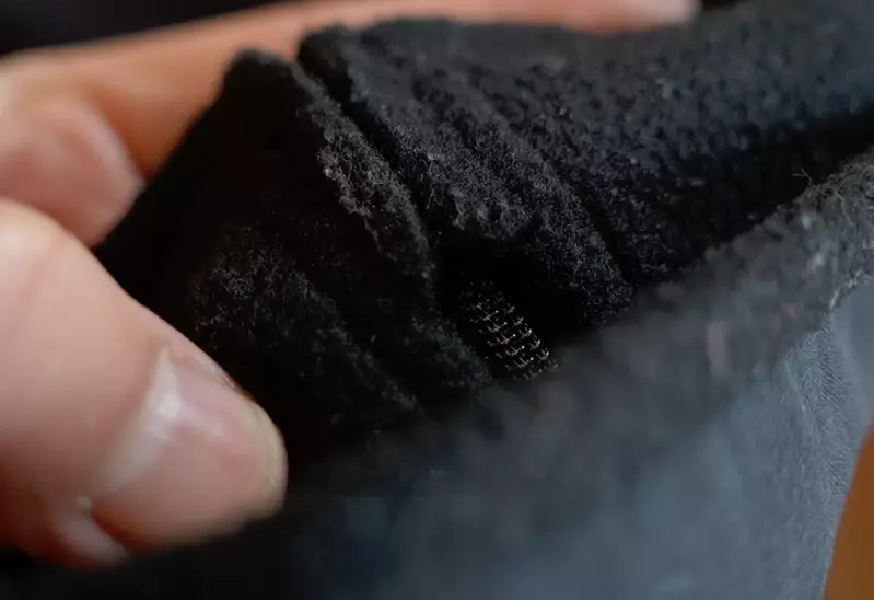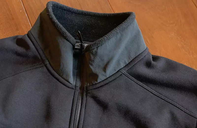 ジッパートップの裏側にはチンガードが備わっています。これはファスナーの金具が顎や口元、喉部分に直接触れず、不快感を軽減してくれるもので、内側に目立たないような形でついています。