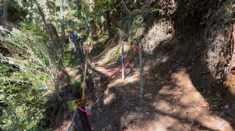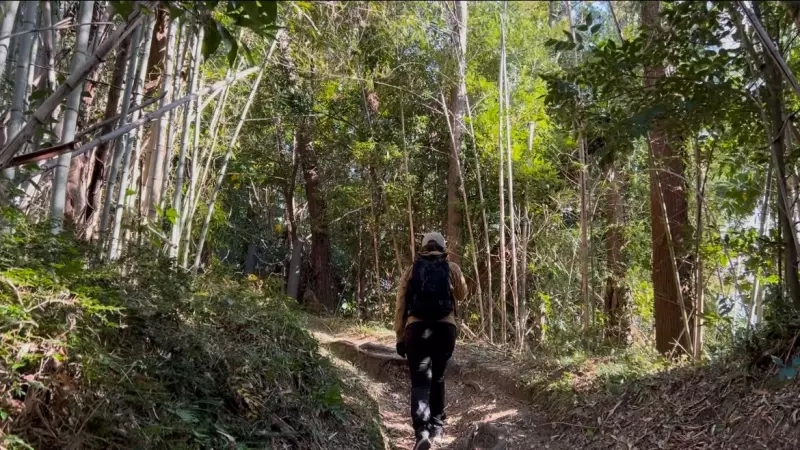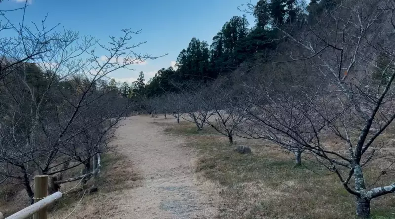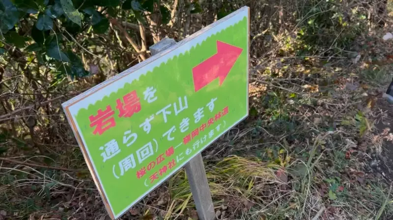 前途の鎖場を下る勇気はなかったので、岩場を避けて迂回路へ、桜の広場を経由し平群天神杜駐車場へ戻ります。2月頃になると早咲きの阿津桜が咲き誇り、登山者を迎えてくれるそうです。