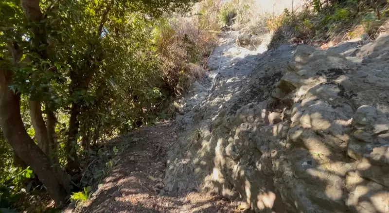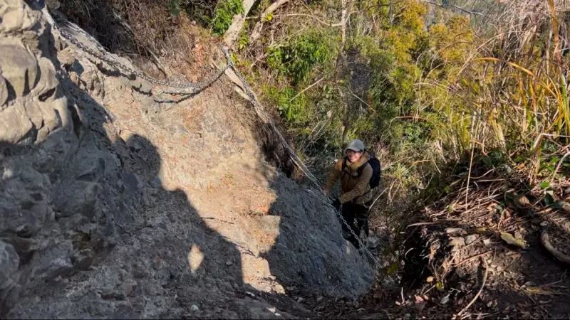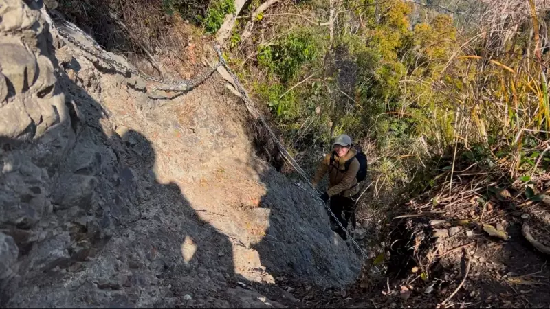 登山道を30分程進んだ先に突如現れる鎖場!