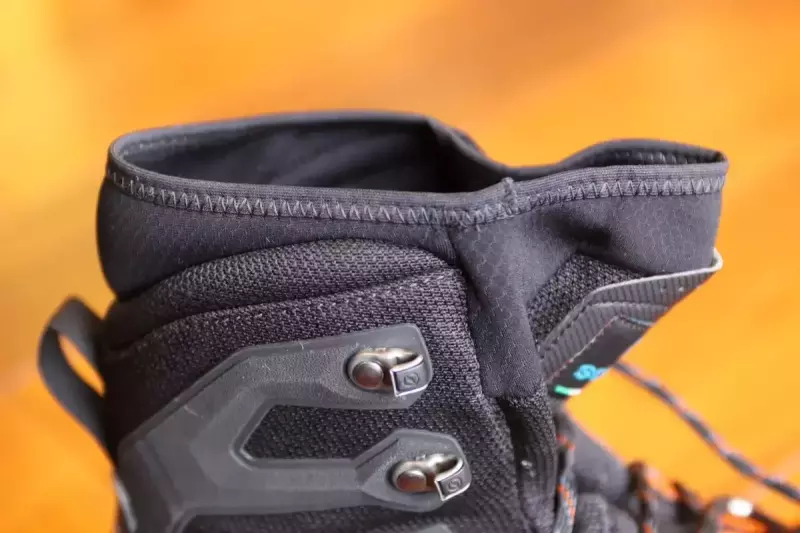 軽量ですが、冬用登山靴らしいしっかりとした剛性感があります。足入れはスムーズで、足首まわりはアッパーとタンが一体となった「ソックフィットシステム」により、心地よいフィット感を実現。さらに、ゲイター装備で雪や小石などの侵入を防ぐと共にヒートロスを防止します。足首まわりは柔軟性が非常に高く、足首の自在な動きを妨げません。