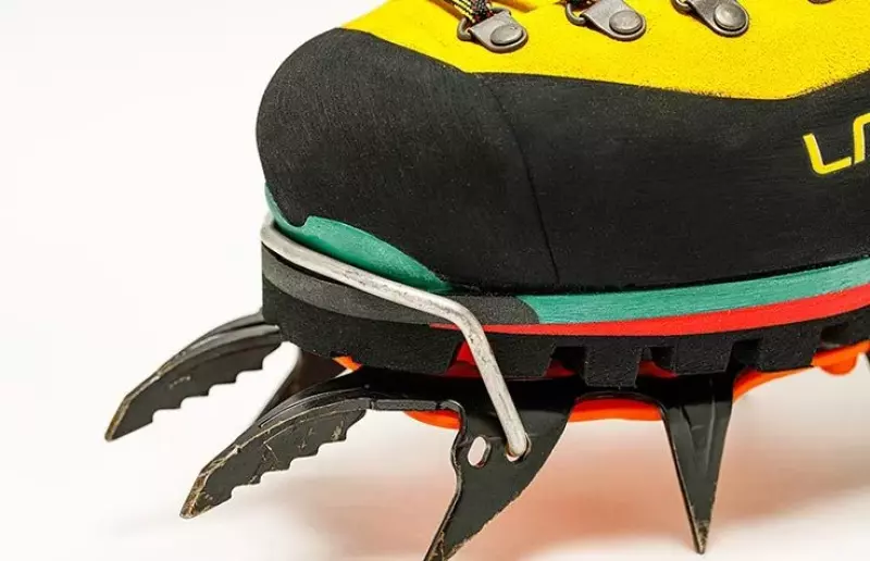 ただし、雪山用登山靴でもコバの無いタイプがあり、その場合、ベルトで縛って固定するアイゼンを使用します。