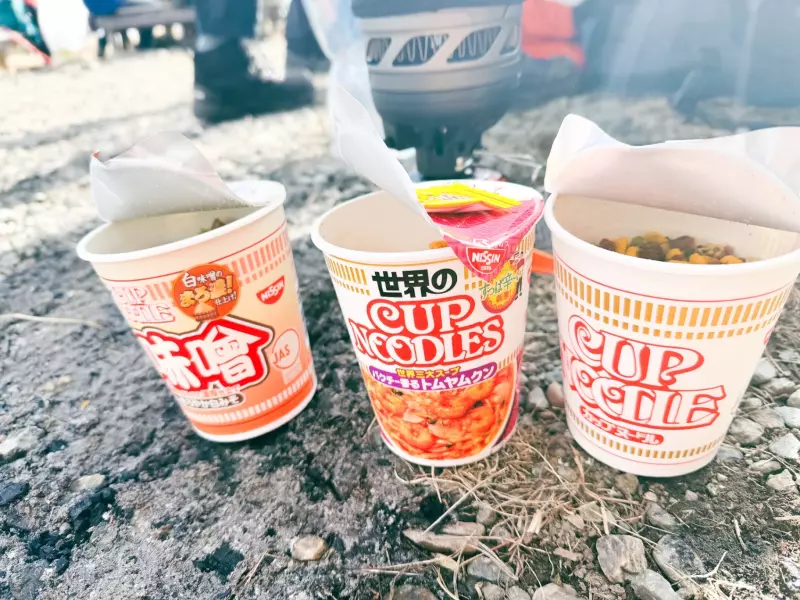 お昼休憩は、花立山荘で。階段を登りながら顔を上げたら、真っ青な空を背景に、青いのれんが出ていた。「うどん」と書いてあった。でもここではジェットボイルを持ってきていたので、私がお湯を沸かしてラーメンを食べる。父さんは、「定番三種」のカップヌードルを持ってきていた。しょうゆ・シーフード・カレー。私たちが持ってこなかったときのことを考えて、3つ持ってきてくれていたみたい。それってすごくお父さんムーブじゃん。
