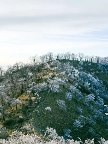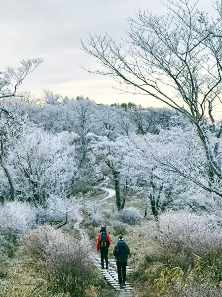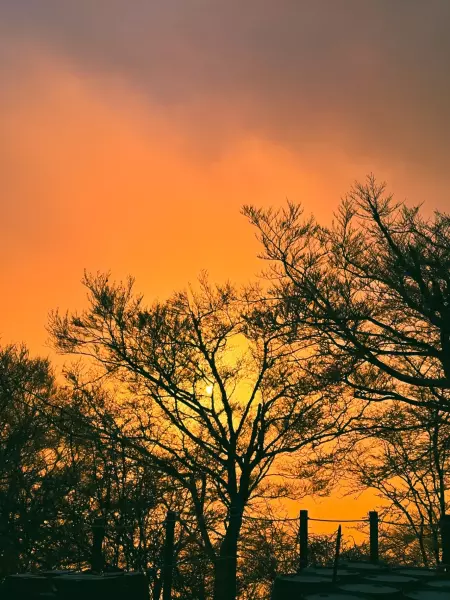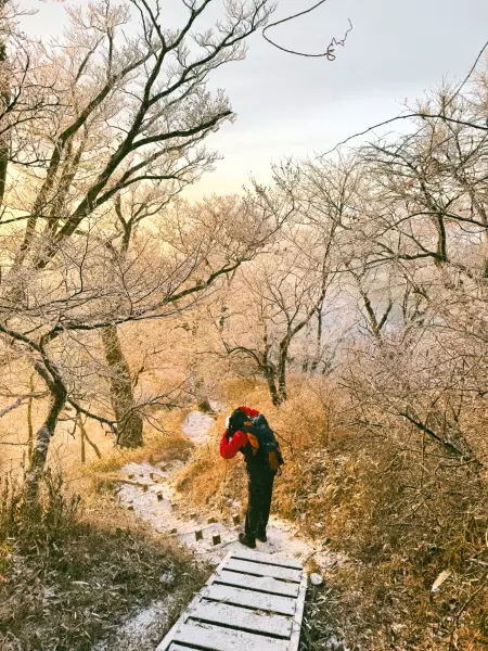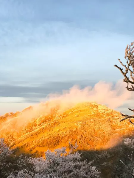 朝食後外に出てみたら、昨日夜景を眺めたところが真っ赤に燃えていて驚く。朝日が登っていたのだ。それはもう鮮やかなオレンジで、山火事のようにしか見えない。世界が一気に明るくなる。日の出に気を取られていると、周りの木が全て樹氷になっていることに気づく。そうか、雪山じゃなくても早朝だと樹氷がつくのか。