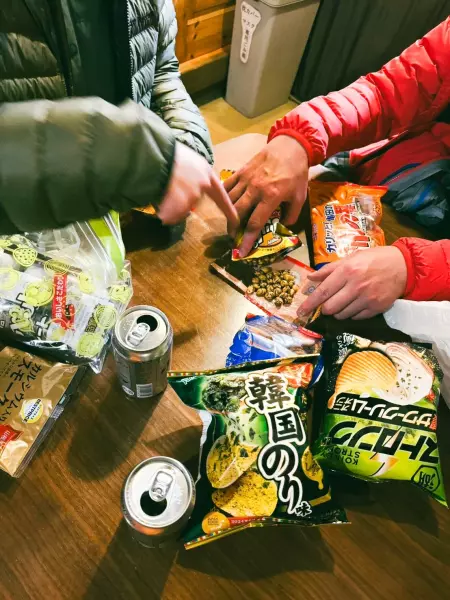 ご飯の時間は30分だったけど、時間いっぱい使ってダラダラ食事した。そのあとは談話室でまたダラダラ晩酌の続き。晩酌用のおやつ持ってきすぎて重かったから、どんどんみんなで食べよう。