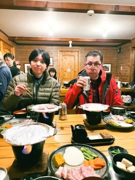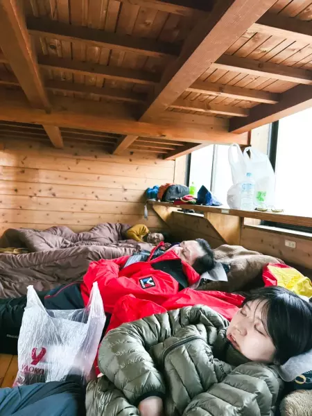 小屋のルールを教えてもらい、今日の寝床へ。個室はほとんどなく、みんなで雑魚寝式。布団がふかふかで嬉しかった。特に敷布団に厚みがあって全然寒くない。小屋の中はずっと暖かかった。夕飯まで2時間くらいあったが、眠すぎたので布団を敷いて寝ることにした。起きたら6時。消灯は8時半だし、山小屋の時間は、案外あっという間に過ぎる。私たちが3時半に到着した時には、2組くらいしか小屋にいなかったけど、起きてみたら二段ベッドの上も下も満杯になってものすごく賑やかにな空間になっていた。夕飯の時間だ。