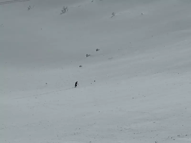 下山はもふもふ雪に包まれて楽勝だよ。ピッケル大事だけど、そのピッケルが邪魔なくらい。トレースあるなし関係ないもんね。気持ちよく滑り降りていたら、ひなこちゃん発見。おーい!ただいまー!