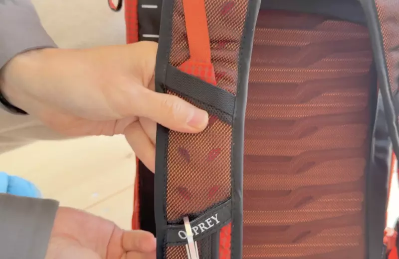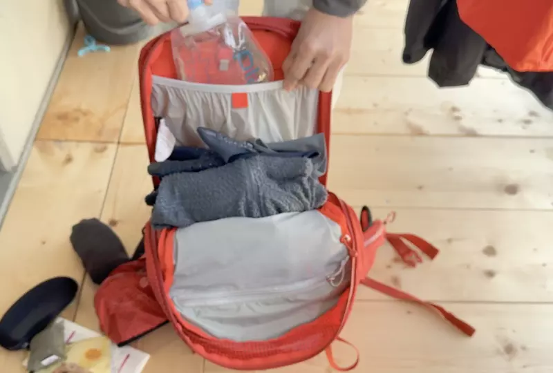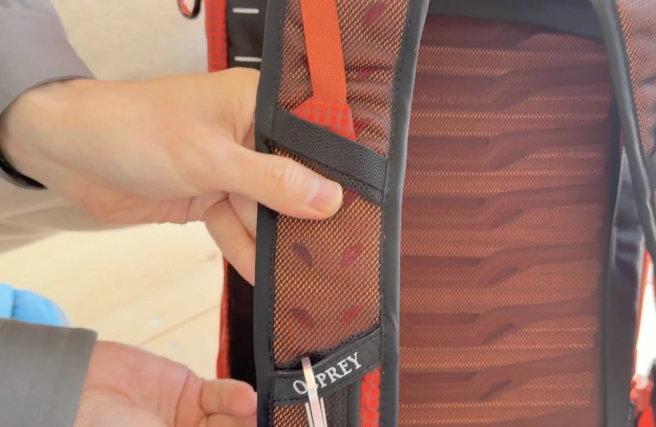 続いてザック上部に備わっているジップ付きポケットには、サングラスケース、ヘッドライト、防風ミトン、紙地図、予備の行動食を収納します。